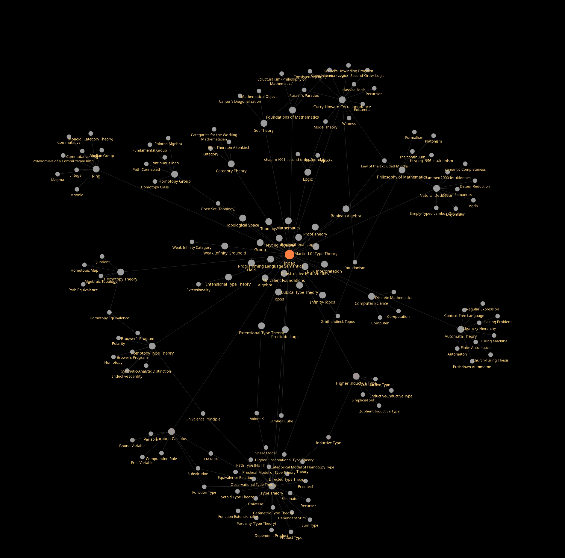 Below is an outline of the topics covered in my personal wiki. The aim is not for completeness, on all topics, but rather to provide the definitions that serve my research. As such some topics, such as Algebra, are only lightly covered, while topics closer to my research area, in type theory, should be covered more thoroughly, although still expect many notes to be stubs, rather than full encyclopedia entries.